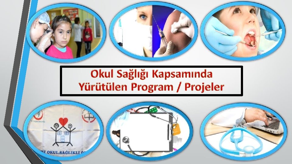 Okul Sağlığı Kapsamında Yürütülen Program/Projeler 1 -Ağız ve Diş Sağlığı Eğitimi ve Koruyucu Ağız Di şSağlığı Çalışmaları 2 -Beslenme Dostu Okul Programı 3 - Beyaz Bayrak Projesi 4 -Büyüme Gelişmenin İ zlenmesi Programı 5 -Fiziksel Aktivite Uygunluk Karnesi 6 - Okul Çağı Çocuklarının Aşılamaları 7 -Okul Çağı Çocuklarında İşitme. Tarama. Programı 8 -Okulda Sağlığın Korunması ve Geliştirilmesi Programı 9 - Okullarda Diyabet Eğitimi Programı 10 -Okul Sütü Programı 11 - Okullarda Şiddetin Önlenmesine Yönelik Çalışmalar 12 - Türkiye Bağımlılıkla Mücadele Eğitim Programı
