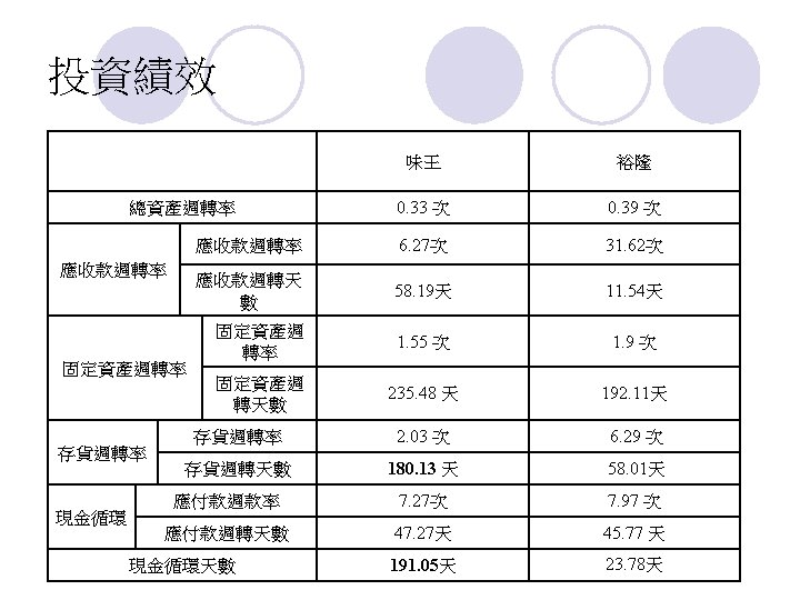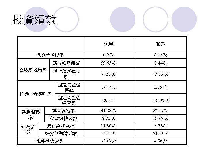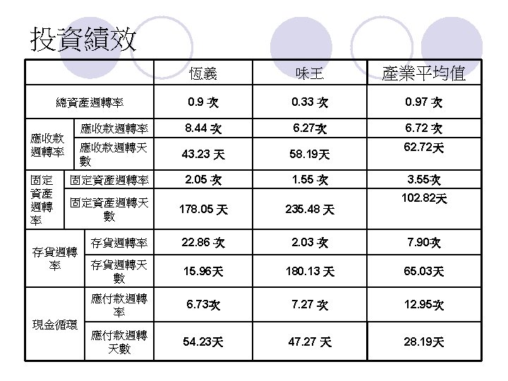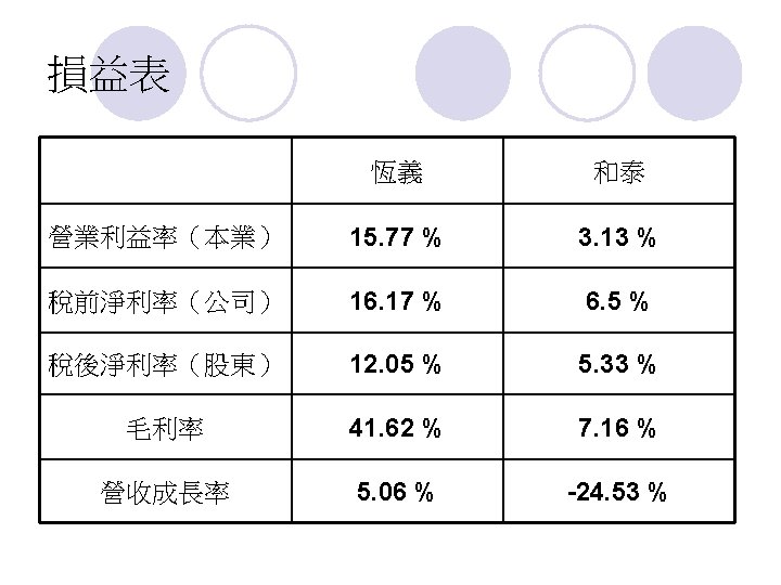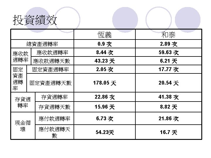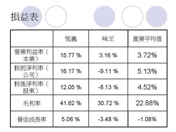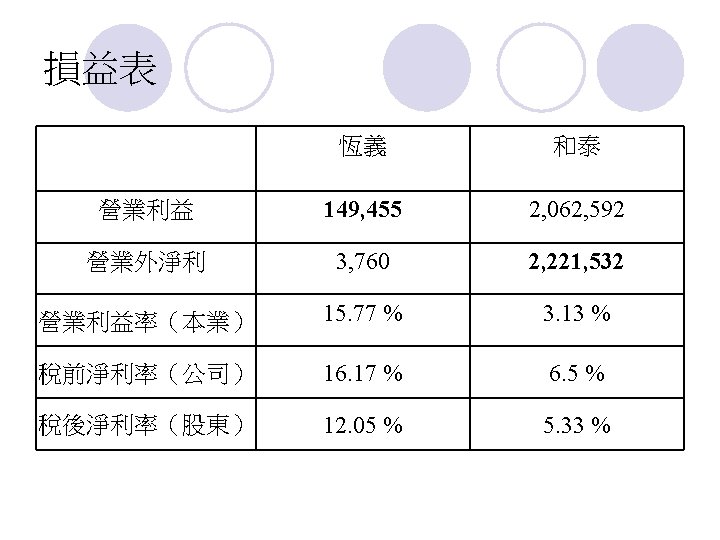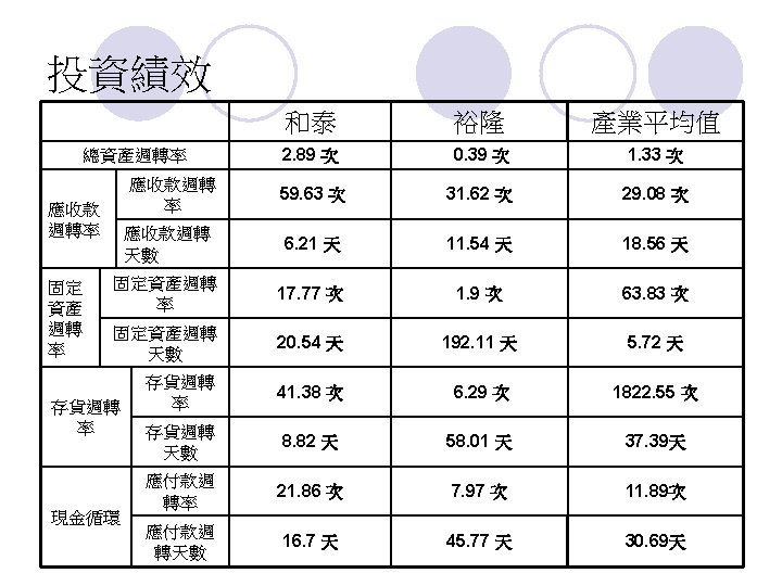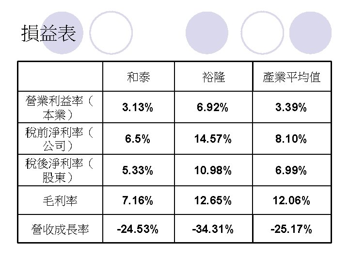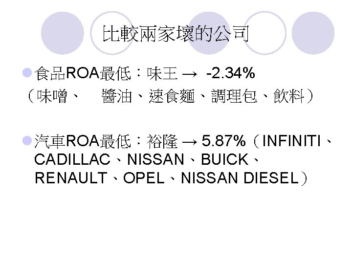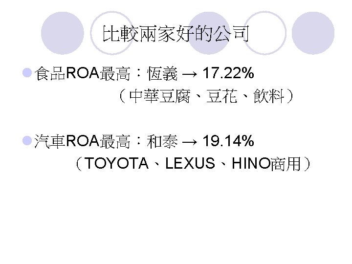 l ROA 19 14 TOYOTALEXUSHINO l ROA 5 Slides: 28 Download presentation 汽車 l ROA最高:和泰 → 19. 14% (TOYOTA、LEXUS、HINO商用) l ROA最低:裕隆 → 5. 87% (INFINITI、CADILLAC、NISSAN、 BUICK、RENAULT、OPEL、 NISSAN DIESEL)