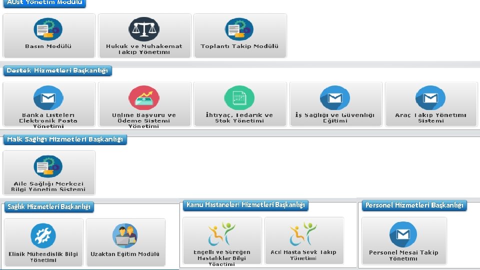 İL SAĞLIK OTOMASYON SİSTEMİ 1. PROJE YÖNETİM MODÜLÜ 11. HUKUK MUHAKEMAT MODÜLÜ 2. ENGELLİ BİLGİ BANKASI MODÜLÜ 12. SEVK (KARAR DESTEK) MODÜLÜ 3. AİLE SAĞLIĞI MODÜLÜ 13. SATIN ALMA MODÜLÜ 4. UZAKTAN EĞİTİM MODÜLÜ 14. BASIN YÖNETİMİ MODÜLÜ 5. AİLE SAĞLIĞI MODÜLÜ 15. FATURA - MAAŞ MODÜLÜ 6. ONLİNE ÖDEME VE BAŞVURU MODÜLÜ 16. BANKA LİSTESİ MODÜLÜ 7. RAPOR İTİRAZ MODÜLÜ 17. ENGELLİ BİLGİ BANKASI MODÜLÜ 8. İŞ SAĞLIĞI VE YÖNETİMİ MODÜLÜ 18. TOPLANTI YÖNETİMİ MODÜLÜ 9. BECAYİŞ MODÜLÜ 19. ORGANİZASYON TAKİP MODÜLÜ 10. KİD MODÜLÜ 20. SICAKLIK NEM MODÜLÜ