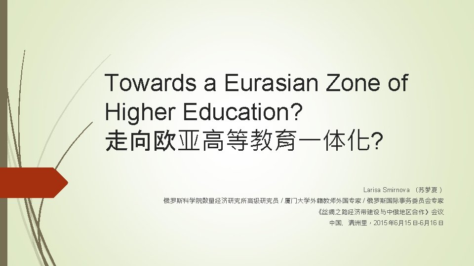 My contacts 电子邮箱:SU. MENGXIA@QQ. COM 或 LRSSMRNV@GMAIL. COM 手机与微信:+(86)15606003575 俄罗斯国际事务委员会主页: http: //russiancouncil. ru/author_profile/index. php? author_id_4=862 新浪微博:@苏梦夏 Academia. edu主页:https: //xmu. academia. edu/Larisa. Smirnova 谢谢!Thank you!