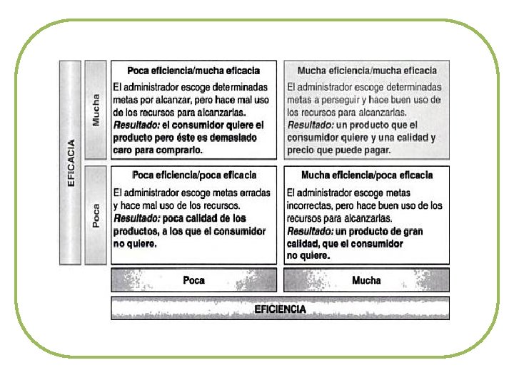 Administración del Siglo XXI Eficiencia *Hincapié en los Medios. *Realización de tareas. *Resolución de Problemas. *Capacitación de Ejecutivos. Eficacia *Hincapié en los Resultados. *Consecución de los Objetivos. *Acierto en la Solución de los Problemas. *Operaciones realizadas.