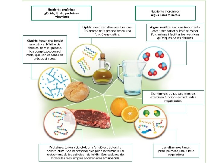 TIPOS DE NUTRIENTES Los alimentos están constituidos por diferentes nutrientes, que podemos clasificar en dos tipos: INORGÁNICOS y ORGÁNICOS.