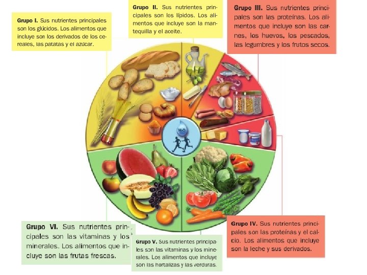 La dieta Dieta: cantidad y tipo de alimentos que consumimos diariamente. Puede ser o no saludable, pudiendo entonces provocar enfermedades. Dieta equilibrada: la que aporta al organismo la cantidad de energía y nutrientes que necesita. Una dieta equilibrada es saludable. Cómo elaborar una dieta equilibrada Tener en cuenta: ● Dieta mixta, alimentos de todos los grupos en la cantidad adecuada. 3 -5 raciones grupo I, 2 -4 raciones grupo III, 2 raciones grupo IV, 2 raciones grupo V, 3 raciones grupo VI y 3 cucharadas aceite. ● Proporcionar energía que necesitamos. Depende trabajo diario, edad, sexo, estatura, peso. . ● Grasas deben proceder de vegetales y pescado azul. ● Distribución del origen de la energía: 55 -60% de glúcidos, 25 -30% de grasas y 1015% de proteínas. ● No más de un 40% de proteínas. ● Incluir fibra vegetal. Mejora motilidad intestinal y previene problemas intestinales.