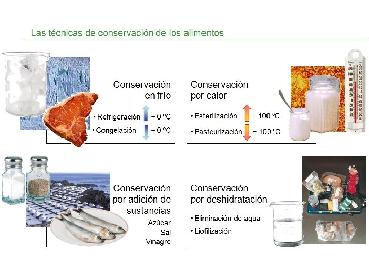 a) CONSERVACIÓN EN FRIO Esta técnica reduce la velocidad de reproducción de los microorganismos. Puede ser: ● Por REFRIGERACIÓN: los alimentos se mantienen por encima de 0ºC. ● Por CONGELACIÓN: los alimentos se mantienen por debajo de 0ºC.