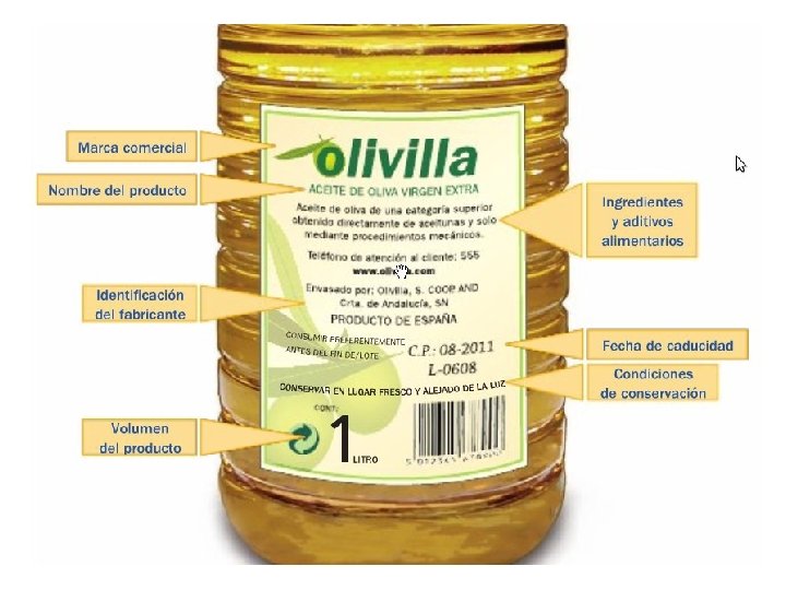 • • • La etiqueta es un garantía de seguridad. Su presencia es obligatoria y debe decir la verdad. La información obligatoria debe figurar en el envase o en una etiqueta unida al mismo de forma que resulte comprensible, fácilmente visible y claramente legible. En la etiqueta tiene siempre que aparecer el nombre del producto y el nombre y domicilio del fabricante, envasador o vendedor. En la mayoría de los casos también debe aparecer la lista de ingredientes, la cantidad neta, la fecha de consumo preferente o la de caducidad y el lote de fabricación. Ciertos productos deben indicar las condiciones especiales de conservación y modo de empleo, y algunos pueden llevar un etiquetado nutricional para que el consumidor conozca sus cualidades alimenticias.