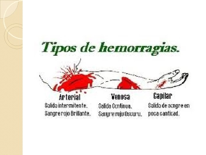TIPOS DE HEMORRAGIAS La gravedad vendrá dada según: � El tipo de vaso que se ha roto: ◦ Hemorragia arterial: ◦ Hemorragia venosa: ◦ Hemorragia capilar: � Según el punto donde se vierte la sangre: ◦ Hemorragia externa: ◦ Hemorragia interna: ◦ Hemorragia exteriorizada: � Según la duración de la hemorragia: ◦ Hemorragia aguda: ◦ Hemorragia crónica: � Según la cantidad de sangre que se pierde: ◦ Hemorragia leve: ◦ Hemorragia grave: ◦ Hemorragia muy grave: