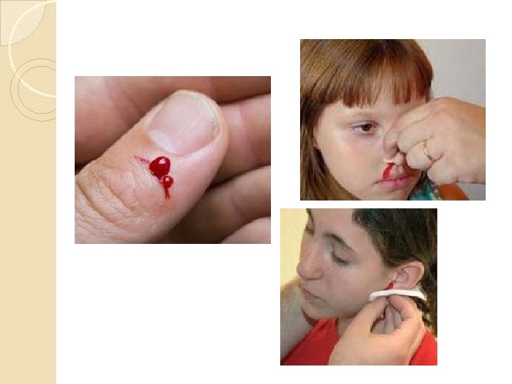 Tipos de hemorragias (cont. ) � Según el punto donde se vierte la sangre: ◦ Hemorragia externa: cuando la sangre se vierte fuera del cuerpo y tienen consecuencias menos graves: es llamativa y alarmante, y enseguida se detecta la hemorragia y se interviene para cortarla. ◦ Hemorragia interna: la sangre se acumula entre los tejidos o en alguna cavidad del interior del cuerpo. Como es menos visible pasa inadvertida más fácilmente, es más peligrosa. ◦ Hemorragia exteriorizada: la sangre se ha vertido en el interior del organismo, pero sale por un orificio natural (boca, nariz, oído, vagina o el ano). �HEMORRAGIA NASAL O EPIXTASIS Las causas pueden ser variadas, por ejemplo un golpe o por una brusca elevación de la presión arterial �OTORRAGIA Es la salida de sangre por los oídos pudiendo ser causados por la rotura de los tímpanos (por ejemplo por el efecto de una onda explosiva producida en las proximidades). �MELENAS Es la salida de sangre por el ano y suelen ser de mucha gravedad, excepto en los casos de enfermos de hemorroides.