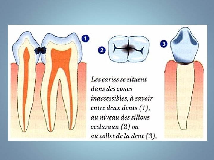 Pourquoi les enfants sont ils plus vulnérables à la carie? • Après éruption: L’émail de l’apatite contient des ions carbonates et magnésium fortement solubles en présence d’acides faibles • Le processus de minéralisation se poursuivra après l’éruption: la plaque et la salive sont super saturées en ions calcium et phosphates • Et il y aura: échange d’ions hydroxyles et fluorures qui permettront un meilleur arrangement cristallographique des atomes…Fluoroapathites qui résisteront jusqu’à un ph de 4. 5