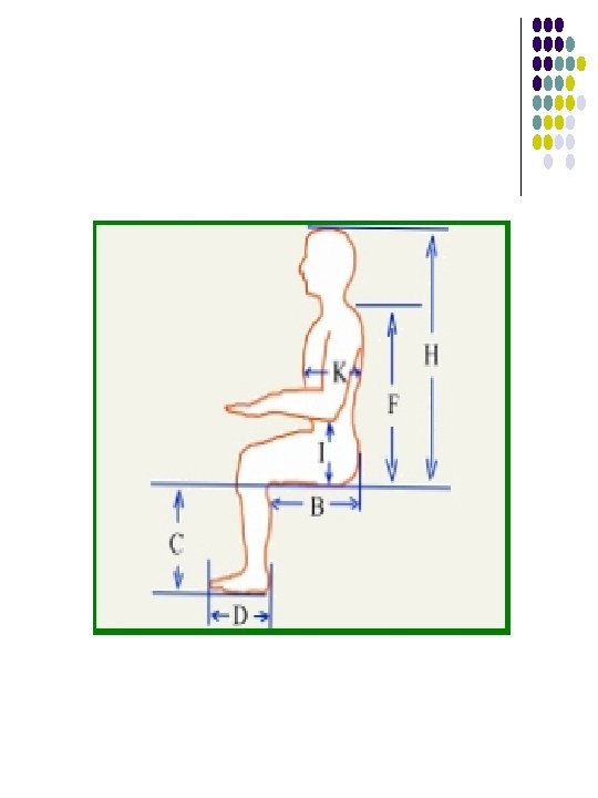 PROFONDITA’ DEL SEDILE: E’ la distanza tra il bordo anteriore del sedile e lo schienale. La profondità del sedile deve essere circa 3 Cm inferiore alla lunghezza della gamba, in modo stabilizzare il più possibile gli arti inferiori. UNA SEDUTA TROPPO LUNGA: lspinge il bacino a staccarsi dallo schienale e la colonna lombare a flettersi lcomprime i vasi ed i fasci nervosi che decorrono nel poplite. UNA SEDUTA CORTA: ldiminuisce la superficie di appoggio e la stabilizzazione degli arti inferiori