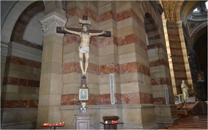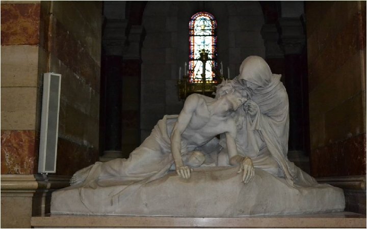 Sous les arcades, on peut voir sept statues Qui représentent Le Christ au centre entouré des apôtres : Pierre, Paul, Lazare, Sœur Marthe, Maximin, Marie-Madeleine.