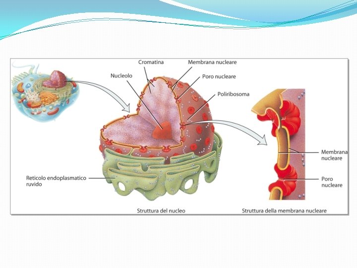 Il nucleo La sua funzione è quella di dirigere la cellula. Lo fa attraverso gli acidi nucleici: DNA (acido desossiribonucleico) e RNA (acido ribonucleico). Il DNA è il materiale ereditario, contiene tutte le informazioni necessarie alla cellula per riprodursi uguale a se stessa e per la costruzione delle proteine. L’RNA ha il compito di dirigere la sintesi delle proteine, per questo passa dal nucleo al citoplasma dove collabora con i ribosomi.