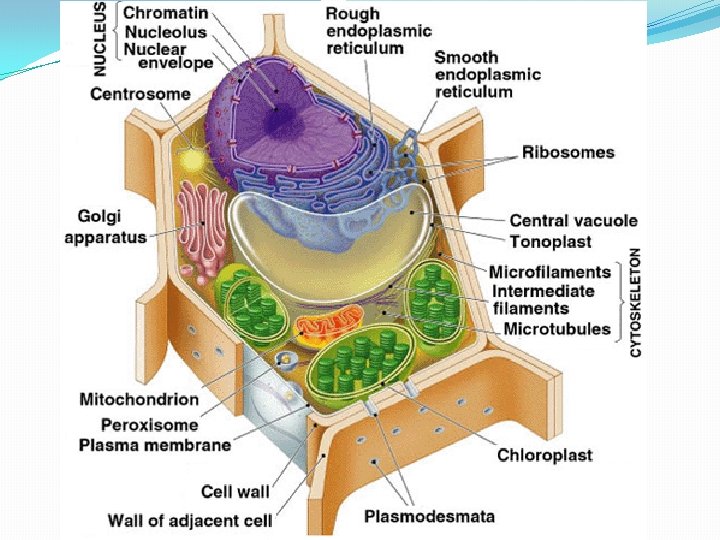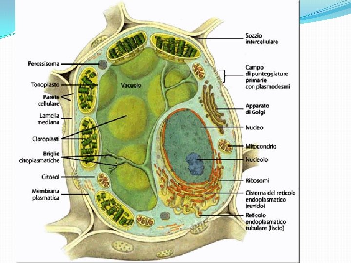 Cellula vegetale Abbiamo fin ora parlato della cellula animale, ma dobbiamo prendere in considerazione anche la cellula vegetale. Essa si distingue da quella animale per tre elementi associati a funzioni importanti: �Parete cellulare; �Vacuoli; �Cloroplasti.