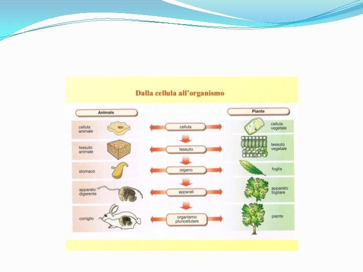 Dalla cellula all’organismo �Tessuto: all’interno di un organismo pluricellulare è detto tessuto un insieme di cellule che svolge una funzione specifica. Esiste per esempio il tessuto muscolare, il tessuto nervoso, ecc. . �Organo: ogni tessuto ha una sua funzione specifica e può partecipare insieme ad altri tessuto alla formazione di un organo. �Sistemi e apparati: quando diverso organi concorrono la stessa funzione si parla di sistemi o apparati. In un sistema gli organi sono simili tra loro (sistema muscolare, ecc. ), mentre in un apparato sono molto diversi (apparato digerente, ecc. ).