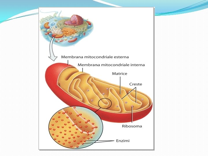 Gli organelli I mitocondri sono gli organelli che producono l’energia. Lo fanno con il processo della respirazione cellulare: I mitocondri utilizzando ossigeno (proveniente dalla respirazione polmonare)“bruciano” gli zuccheri (provenienti dal cibo che mangiamo).