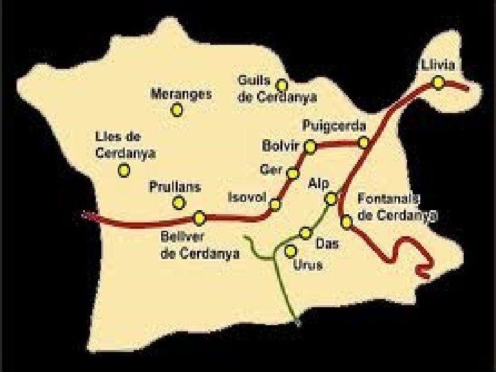 • Història • La Cerdanya ha estat un territori històric de Catalunya i va ser dividit com a conseqüència del Tractat dels Pirineus (1659) entre el Regne d'Espanya i el. Regne de França, pel qual Espanya va cedir a França 33 pobles de la part nord cerdana. Es varen cedir tots els pobles de l'Alta Cerdanya menys la població de. Llívia ja que té el títol de vila, i és per aquesta raó que Llívia és un enclavament d'Espanya a França. Després, el 1833, el sector espanyol quedà fraccionat entre les demarcacions de Lleida i Girona. L'agricultura i la ramaderia van ser durant molts anys la base econòmica, però al final del segle XIX els primers estiuejants, gent benestant de Barcelona, construïren cases luxoses on passar l'estiu. Les millores urbanístiques a la capital cerdana es van notar i l'any 1922 hi arribava el tren de Barcelona, i més tard, al 1927 el Tren Groc. Amb les estacions d'esquí i l'obertura del túnel del Cadí al 1984, el turisme va fer recular l'agricultura i la ramaderia. Avui el turisme és el motor que impulsa l'esquí, l'hosteleria, la construcció i el comerç.