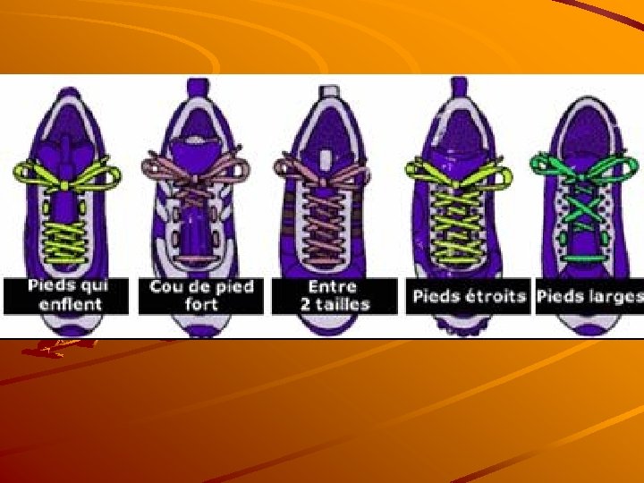 Réponses Techniques Calcule de la pointure exacte (Pédimètre) Achat des chaussures le soir Essayer les 2 pieds Marcher / Courir / Sauter dans le magasin Faire glisser le pied vers l’avant – Possibilité de passer l’index entre la chaussure et le talon Changer de modèle en cas de doute Techniques de laçage