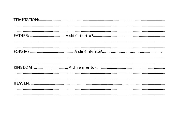 Esercizio: completa il seguente testo inserendo le seguenti parole e successivamente traducile: temptation, Father, forgive, kingdom, heaven. Our……………, who are in heaven, hallowed be your Name. Your …………. . come, Your will be done, on earth as it is in …………………. . Give us this day, our daily bread, and …………. . us our trespasses as we forgive those who trespass against us. And lead us not into…………………, but deliver us from evil. Amen.