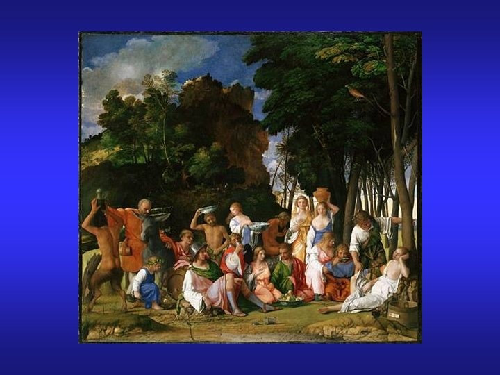Il festino degli Dei Nel 1512 Alfonso d'Este, Duca di Ferrara, commissionò a Giovanni Bellini (dx) un dipinto che diventerà capolavoro del Rinascimento italiano: il già citato Festino degli Dei, oggi conservato presso la National Gallery of Art di Washington La scena rappresenta un baccanale ispirato agli scritti di Ovidio. Il dipinto doveva andare ad arricchire lo studio privato nonchè stanza dei tesori del Duca, noto come camerino d'alabastro. Nel 1514 il dipinto era finito: Bellini lo siglò e ricevette un pagamento di 85 ducati da Alfonso
