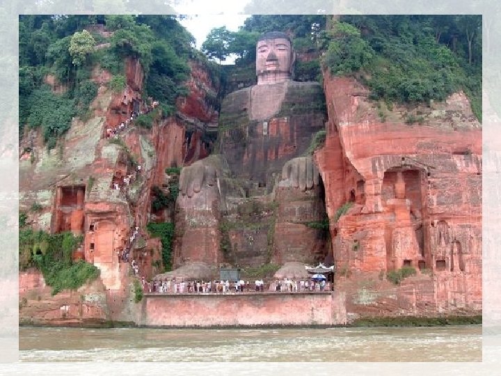 Le Grand Bouddha de Leshan est une statue monumentale de Bouddha taillée dans la falaise du mont Lingyun « la montagne qui monte dans les nuages » ), sur la rive est de la rivière Min dans la région du mont Emei, au Sichuan. Édifié approximativement entre 713 et 803, est, par ses dimensions, le plus grand Bouddha du monde antérieur au XXe siècle, et la plus haute statue de Maitreya, avec ses 71 mètres de haut pour 28 mètres de large. Sa tête fait 14, 7 mètres de haut. Chaque œil mesure 3 mètres de long, et chaque oreille 7 mètres. Le majeur de la main de Bouddha mesure 8 mètres de long, et sa tête est ornée de 1021 petits chignons de cheveux enroulés, taillés dans des blocs de pierre encastrés dans sa tête comme des chevilles. De chaque côté de la statue se trouvent des guerriers, beaucoup plus petits puisqu'ils ne font que 8 mètres de haut. Derrière eux, sur la colline, se trouvent plusieurs pavillons, dont le plus spectaculaire est la pagode Lingbao, d'époque Tang, à laquelle mène un escalier. Photo diapo suivante.