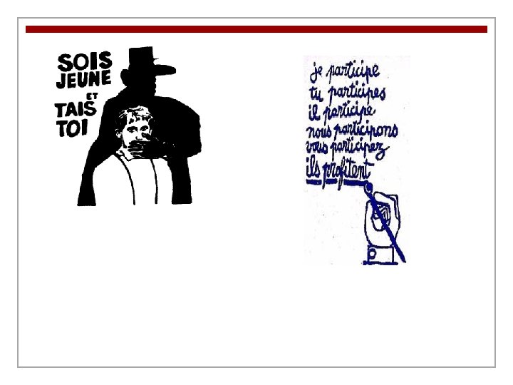 Questions 3. Qu’est-ce que chacun (chaque personnage) représente? n Les fils représentent les fils qui adorent leur mère et le respect et l’amour de la mère dans la culture maghrébine (la culture musulmane de l’Afrique du Nord). L’intelligence, l’éducation, la civilisation. n La mère représente la femme musulmane isolée, négligée sans voix à la recherche d’une identité et d’une éducation. n Le père représente le patriarcat, une société dominée par les hommes qui ne fait pas attention aux femmes.