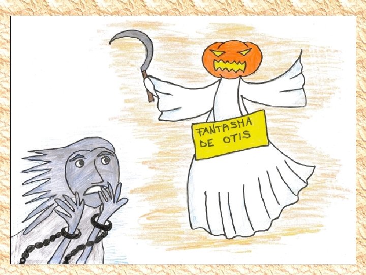 L’apparizione fu programmata per il 17 agosto, un venerdì, ed egli incominciò a prepararsi. Guardò nel suo guardaroba e scelse per il travestimento un vecchio cappello con una piuma rossa, un sudario e una spada arrugginita. Alle undici e un quarto, il castello giaceva nella più profonda quiete. Il buio era fitto e tutti dormivano. Il fantasma attese ancora un po’ e allo scoccare della mezzanotte uscì dalla sua stanza. L’orologio suonava il quarto ed egli pensò che fosse giunto il momento di passare all’azione. Non appena ebbe svoltato l’angolo, si bloccò con un gemito di terrore e si coprì il volto con le mani. Davanti a lui stava un orribile mostro immobile. Aveva la testa pelata, la faccia grassa e rotonda, l’espressione ghignante. Gli occhi splendevano di una luce scarlatta e la bocca sembrava un forno acceso. Il vestito era orrendo come il suo. Sul petto aveva un cartello con una scritta in caratteri illeggibili. In mano un falcetto luccicante. Non gli era mai capitato, nei suoi 300 anni di vedere un fantasma. Il suo spavento fu grande. Fuggì come un pazzo nella sua stanza. Si gettò sul suo giaciglio e nascose il volto sotto le coperte. Era demoralizzato come non lo era mai stato in vita sua. Poi lo spirito valoroso dei Canterville gli diede forza ed egli decise di andare a parlare all’altro fantasma, alle prime luci dell’alba. La sua intenzione era quella di mettersi d’accordo con lui per battere gli americani. All’alba si recò sul posto ma uno spettacolo terribile lo attendeva. Il fantasma era appoggiato al muro e non mandava più quella luce terribile dagli occhi, mentre il falcetto giaceva a terra. Lo afferrò per le braccia e in quel momento la testa rotolò sul pavimento. Si accorse infine che stringeva tra le mani un lenzuolo di cotone bianco e una scopa. La testa non era altro che una zucca scavata. Afferrò il cartello e vide chiaramente ciò che prima sembrava