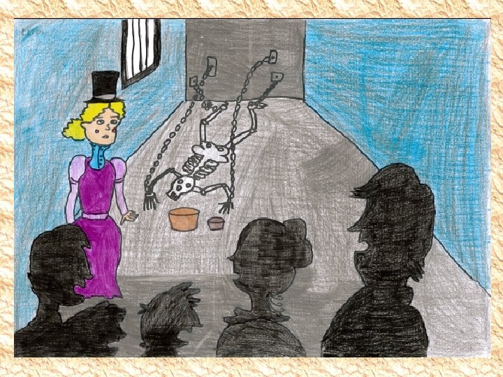Mentre uscivano dalla sala per andare a dormire, l’orologio della torre suonava la mezzanotte. All’ultimo rintocco si udì un gran tonfo e subito dopo un grido. Un potente tuono fece tremare il castello. In cima alle scale si aprì un passaggio segreto e all’improvviso apparve Virginia. Era pallida e triste. Aveva in una mano un piccolo scrigno. Tutti corsero ad abbracciarla. «Dove ti eri cacciata? Tua madre a momenti moriva di spavento. Ti abbiamo cercata dappertutto. Non devi più farci questi scherzi!» la rimproverò il padre. «Gli scherzi solo al fantasma!» gridarono saltellando i gemelli. «Papà sono stata col fantasma» incominciò a dire Virginia. Adesso è morto veramente. E’ stato molto malvagio, ma si è pentito di tutto il male che ha fatto e ha chiesto perdono. Prima di morire, mi ha regalato questo scrigno pieno di favolosi gioielli. » La famiglia, la servitù e il fidanzato la guardarono sbigottiti in silenzio. Lei li invitò a seguirla ed essi obbedirono. Li condusse attraverso uno stretto passaggio segreto e arrivarono in una stanza umida, bassa e stretta con il soffitto a volta e una finestra con l’inferriata. Ad un muro era conficcato un grande anello di ferro, al quale era incatenato uno scheletro che giaceva sul freddo pavimento di pietra. Le mani dello scheletro tendevano verso due ciotole irraggiungibili, che un tempo avevano contenuto acqua e cibo e ora solo polvere. Virginia si inginocchiò e in silenzio si mise a pregare. Tutti gli altri rimasero in rispettoso raccoglimento, mentre rivivevano la tragedia avvenuta 300 anni prima. Quattro giorni dopo, verso le undici di sera, si svolse il funerale del fantasma. Quella notte un uomo ricevette sepoltura con 300 anni di ritardo.