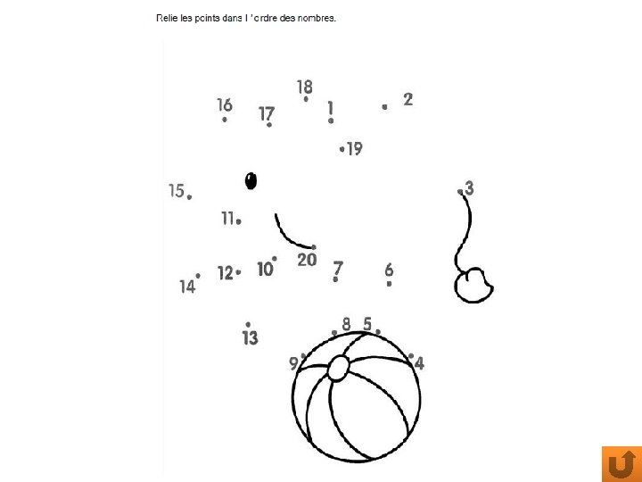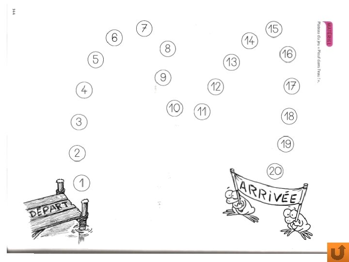 MOTRICITE FINE: § § Dessine une rose Découpe sur un trait LANGAGE ECRIT ET ORAL: § Course du le et du la 1. Cherche dans la maison des objets dont l’article est « la » , puis fais la même chose avec l’article « le » 1. Ecris les mots différents le et la en écriture cursive sur deux papiers 2. Choisis un objet dans la maison et déposes-y le bon article (le ou la) JEUX MATHEMATIQUES: § Joue au jeu « Plouf dans l’eau » § INFOS PARENTS: 1. Votre enfant doit réciter la suite numérique en pointant les cases 2. Masquez certains nombres à l’aide d’un pion, bouchon… Votre enfant doit réciter la suite numérique sans dire les nombres où se trouvent les pions. Relie les points dans l’ordre des nombres