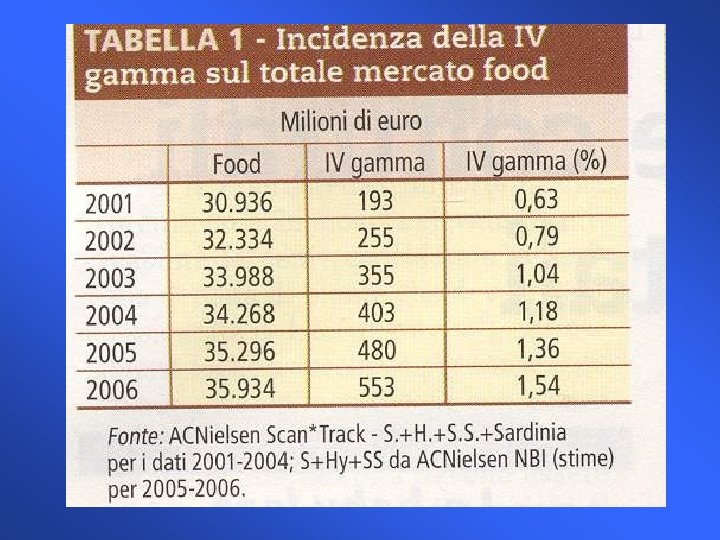 Insieme di prodotti ortofrutticoli freschi puliti, tagliati, confezionati e pronti per il consumo immediato Coltivazione materia prima Raccolta Handling Cernita e Mondatura Taglio Lavaggio LA IV GAMMA Trattamento con antiossidanti Trasporto refrigerato Distribuzione e Vendita Stoccaggio refrigerato Dosatura e Confezionamento Asciugatura