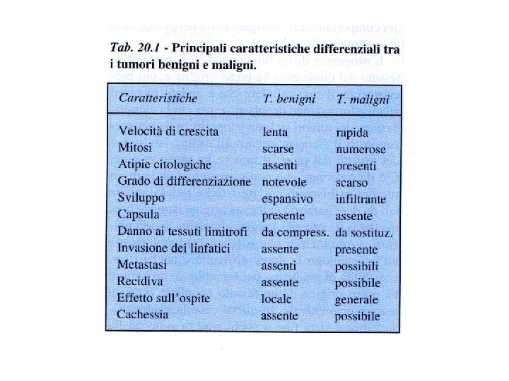 Classificazione in base al comportamento biologico In riferimento alle caratteristiche morfologiche delle cellule ed alle modalità di accrescimento e comportamento nei riguardi dei tessuti limitrofi e all’interno dell’organismo vengono suddivisi in: Benigni Maligni Ben differenziato. Il tessuto di origine è ben riconoscibile La struttura del tessuto di origine è perduta in vario grado così come il differenziamento delle singole celluleanaplasia. Pleiomorfismo cellulare: forma e dimensioni non uniformi. Aumento dimensioni generalmente con una certa regolarità fino ad arrivare ad uno stadio limite o regredire. Mitosi rare e normali. Espansiva. Irregolare. Può essere lenta e poi improvvisamente rapida. Mitosi numerose e con forme abnormi La massa tumorale è compatta. Comprimono i tessuti vicini senza infiltrarli. Non invasivo. Spesso “incapsulati” (adenomi) Lassi e senza capsula. Compressione. Sintomi da iperfunzione Distruzione dei tessuti per infiltrazione; disseminazione metastatica; cachessia. Non recidivano se asportati bene. Non mortali. Possono recidivare. Mortali se non curati. Espansiva e invasiva. Invasiva a livello locale e a distanzametastasi. Provocano cachessia