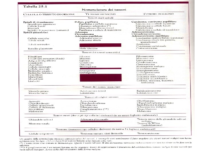 “limiti” di questo tipo di classificazione 1) Assenza di regola precisa nella nomenclatura: Melanoma (melanocarcinoma) Mieloma, linfoma: tumori maligni 2) Assenza di informazioni sulla fase del tumore quindi sulla prognosi: Angioma del fegato spesso scoperto a livello di autopsia; angioma nella cute del neonato possono evolvere in tumefazioni orribili e poi regredire o sparire; altri persistono e sono molto difficili da trattare Papilloma tumore benigno (lo sono quelli cutanei). A livello della laringe cresce molto rapidamente (può uccidere per soffocamento). A livello della vescica è spesso maligno (recidivano dopo asportazione, trasformazione maligna). Adenocarcinoma tumore maligno; se avviene a livello della prostata il pz può vivere per anni; nel pancreas, morte del pz entro 3 mesi dalla diagnosi. Tumori a livello cutaneo carcinoma basocellulare (Basalioma): origina dallo strato basale dell’epidermide. Altamente invasivo a livello locale ma non metastatizza. Carcinoma a cellule squamose cutaneo: molto metastatizzante Tumori del testicolo Seminoma: forma di carcinoma che tende a diffondersi ai linfonodi disposti lungo le arterie iliache e l’aorta. Molto radiosensibile e si tratta con la radioterapia. Raramente mortale Carcinoma embrionale del testicolo: non radiosensibile, invade a livello locale e poi si dissemina. Prognosi infausta. Nevo pigmentato: nel palmo della mano o del piede va facilmente incontro a trasformazione maligna. Va rimosso fin dall’infanzia
