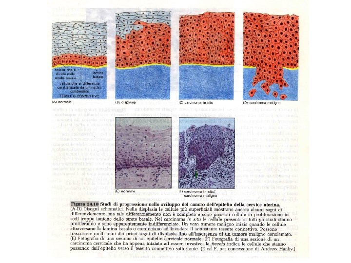 Displasia Situazione che indica anomalie nel differenziamento di cellule epiteliali o mesenchimali sottoposte a stimoli proliferativi. ü Displasia squamosa dell’epitelio della cervice uterina; (CIN: neoplasia intraepiteliale cervicale) ü Displasia squamosa dell’epitelio respiratorio: (fumatori). Displasia > Neoplasia (carcinoma in situ: epitelio di rivestimento viene rimpiazzato da uno strato di cellule maligne, ma i confini istologici sono “ancora” rispettati. La membrana basale è intatta > carcinoma invasivo)