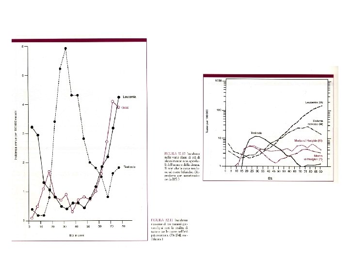 Epidemiologia dei tumori Ruolo dell’età: in generale i tumori aumentano con l’aumentare dell’età. Alcuni tumori tuttavia sono caratteristici di una fascia di età. ü ü La maggior parte dei carcinomi si manifesta in età avanzata. Leucemia acuta e tumori cerebrali (neuroblastoma) sono “frequenti” nell’infanzia