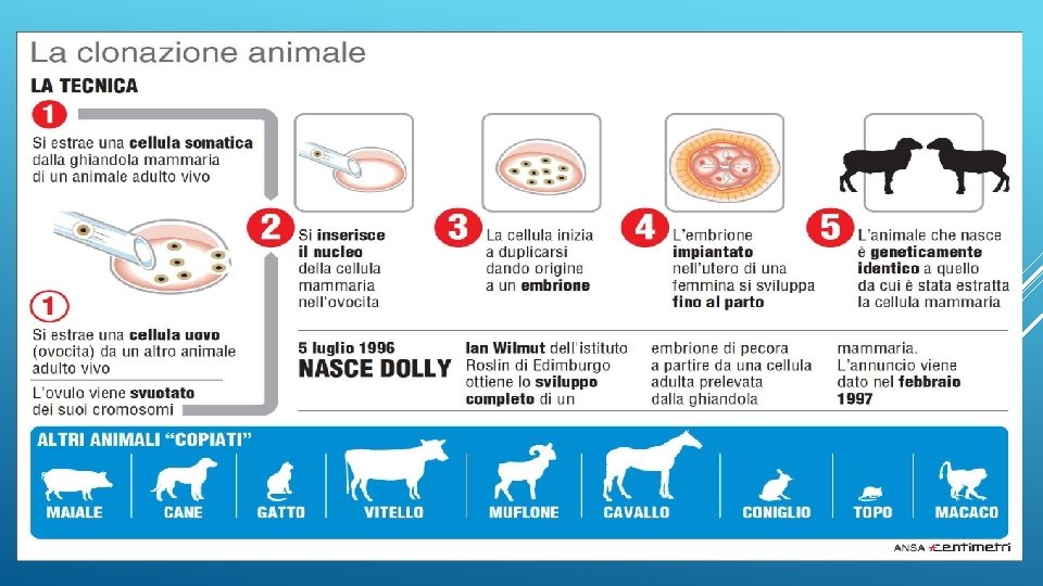 LE TAPPE DELLA CLONAZIONE Circa 4000 anni fa Produzione per talea dei primi cloni di piante; 1855 Clonazione di organismi animali (ricci di mare); 1951 Prima clonazione di animali (rane) ottenuta con successo; 1972 Clonazione di un frammento di DNA (importante per il proseguo della ricerca; 1979 Formazione multipla di embrioni da uno solo; 1993 Duplicazione di embrioni umani in laboratorio, clonando 17 embrioni umani, con la fecondazione in vitro, ottenendo 48 embrioni geneticamente identici; 1996 Prima clonazione di mammifero: Nasce la pecora Dolly dopo 297 tentativi falliti (ad opera di Wilmut e Campbell, Glasgow – Scozia). Dolly morirà nel 2003 di artrite, per effetto dell’invecchiamento precoce; 2000 Corea: viene interrotto lo sviluppo di cloni umani ai primi stadi di crescita; 2003 Corea: viene iniziato lo sviluppo di cloni ai fini terapeutici.