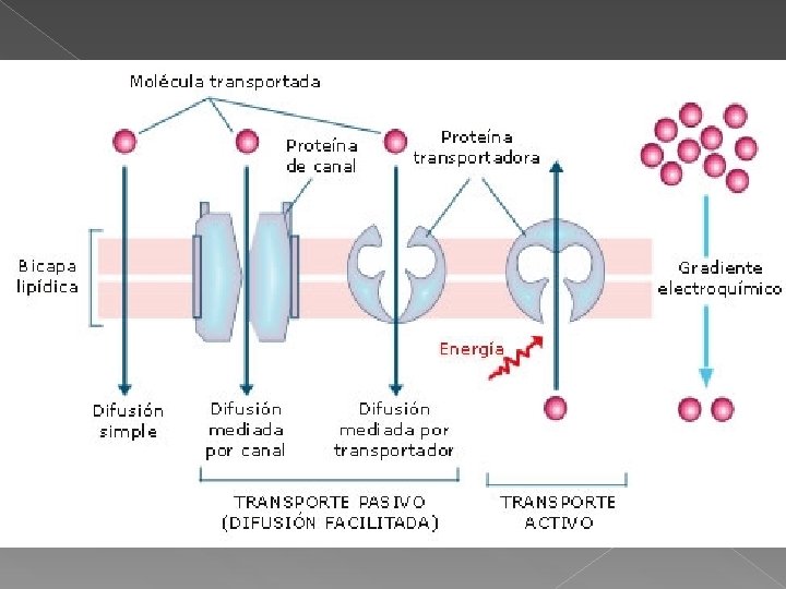 Transporte de membrana: tipos TRANSPORTE PASIVO DIFUSION SIMPLE O PASIVA: es un fenomeno espontaneo que no requiere gasto de energia y que no requiere de la ayuda de ninguna proteina para pasar de un lado al otro de la membrana. DIFUSION FACILITADA: es un fenomeno que no requiere de energia, pero necesita de la presencia de proteinas que lo transporten.