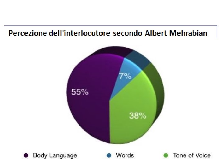 • Aspetto verbale (parole e frasi): 7% • Aspetto vocale (timbro, tono, ritmo): 38%. • Movimenti del corpo (espressioni del viso in particolare, ma non solamente): 55% APPARE FONDAMENTALE “COME LO DICI” E NON “COSA DICI” Albert Mehrabian