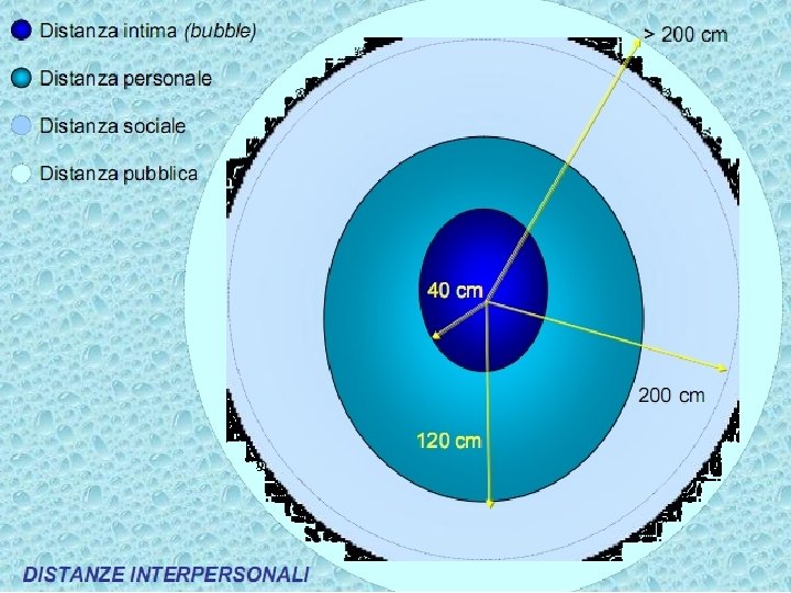 • La distanza intima (0 -45 cm). • La distanza personale (45 -120 cm) per l'interazione tra amici. • La distanza sociale (1, 2 -3, 5 metri) per la comunicazione tra conoscenti o il rapporto insegnante-allievo. • La distanza pubblica (oltre i 3, 5 metri) per le pubbliche relazioni.