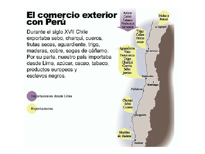RESUMEN DE LA ECONOMÍA COLONIAL Siglo XVI Explotación de los lavaderos de oro. Siglo XVII Exportación de sebo, charqui y cuero. Siglo XVIII Exportaciones de trigo, plata y cobre. Productos de Cobre – CODELCO 1989
