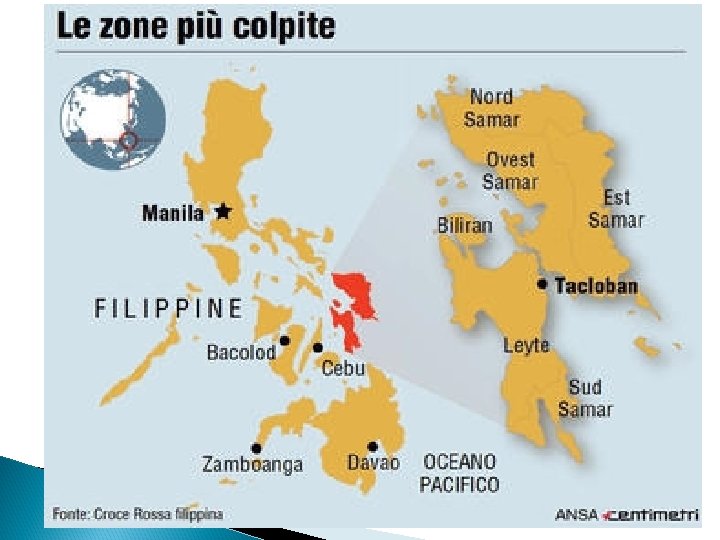 Tifone Haiyan L’ 8 Novembre 2013, uno dei tifoni più forti che abbiano mai raggiunto la terra ha causato la distruzione di 44 province delle Fillippine, nelle isole di Visayas, Nord Mindanao e Sud Luzon. Secondo il National Disaster Risk Reduction Management Council, sono stati registrati 5. 235 morti, 23. 501 feriti e 10. 009. 000 persone colpite dalla devastazione del tifone.