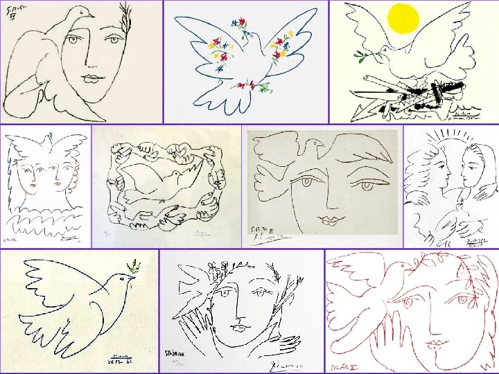 La colomba della pace nelle opere di Picasso In piena guerra fredda, con la paura costante dello scoppio imminente di una guerra atomica, Picasso dedica molte opere al tema della pace e al suo simbolo: la colomba. Tra queste una sciarpa, realizzata in cotone stampato, per il Festival mondiale dei giovani e degli studenti per la pace di Berlino 1951.