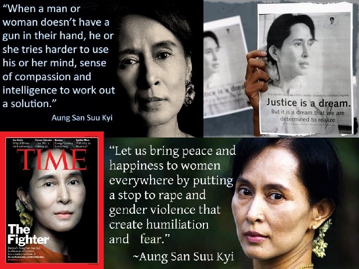 Aung San Suu Kyi Un anno dopo le furono comminati gli arresti domiciliari, con la concessione che avrebbe potuto abbandonare il paese, ma Aung San Suu Kyi rifiutò la proposta. Nel 1990 le elezioni portarono a una schiacciante vittoria del partito di Aung San Suu Kyi, che sarebbe diventata Primo Ministro, tuttavia, i militari presero il potere con la forza, annullando il voto popolare. L'anno successivo Aung San Suu Kyi vinse il premio Nobel per la Pace e usò i soldi del premio per costituire un sistema sanitario e di istruzione a favore del popolo birmano. Gli arresti domiciliari le furono revocati nel 1995, ma non poté mai lasciare il paese, altrimenti le sarebbe stato negato il ritorno in Myanmar, anche ai suoi familiari non fu mai permesso di visitarla, neanche quando il marito Michael si ammalò di cancro, malgrado i numerosi interventi degli Stati Uniti, dell’ONU e di papa Giovanni Paolo II. Nel 2002, scampò ad un attentato e fu di nuovo messa agli arresti domiciliari, la sua salute andava peggiorando e gli USA e l'Unione europea fecero forti pressioni sul governo del Myanmar per la sua liberazione, ma gli arresti domiciliari furono rinnovati. Nel 2010 Aung San Suu Kyi è stata liberata e nel 2012 ha ottenuto un seggio al parlamento birmano. Nonostante ciò la Birmania non è ancora libera , il passato dittatoriale grava ancora sulla nazione.