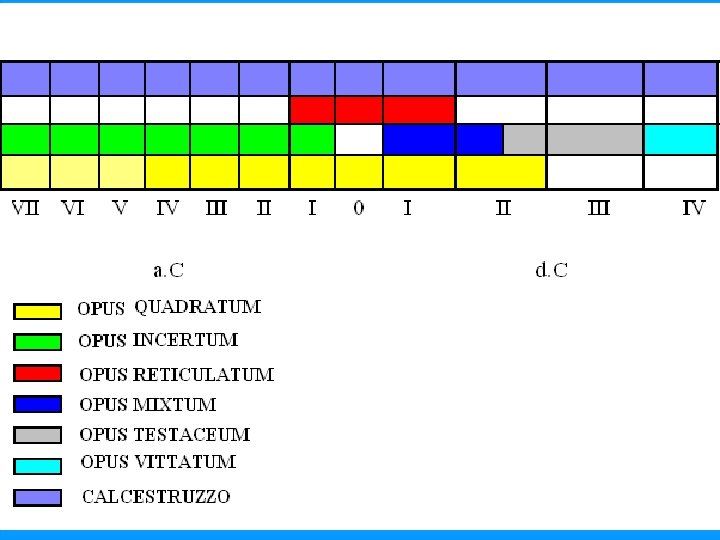 Opus cementicium (calcestruzzo) • Il calcestruzzo romano era un conglomerato di malta, sassi, scaglie di tufo o di selce. Venne inventato dai romani nel III sec. a. C. , l’epoca in cui iniziò la loro espansione nel Mediterraneo e in cui si consolidò un’economia schiavistica • Si trattava di un materiale edile solido e poco costoso che poteva essere preparato e utilizzato dagli schiavi, manodopera a basso costo ma priva di competenze specialistiche (necessarie, invece, ad es. , per il taglio delle pietre necessarie all’opus quadratum).