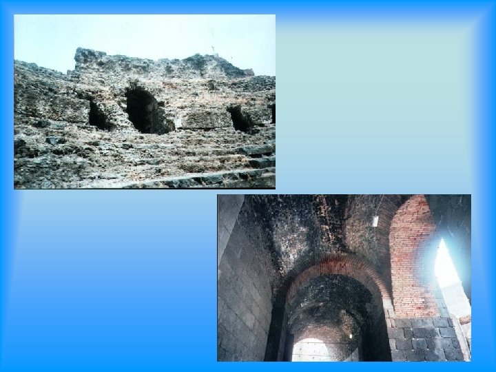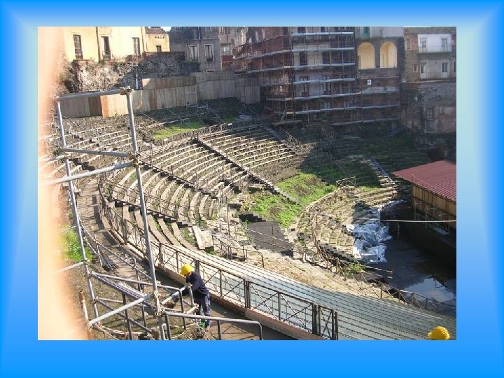 • la sezione più alta della scalinata (summa cavea) è costruita senza appoggi naturali, alla maniera dei Romani (i Greci, come si è detto, non costruivano, ma “scavavano”) • gli archi e le volte presenti nel teatro, elementi architettonici sconosciuti ai greci, sono tipiche espressioni dell’architettura romana • i muri sono di calcestruzzo, un materiale inventato dai Romani nel III sec. a. C. e sconosciuto ai greci • infine, le pareti del teatro sono rivestite in opus incertum, tipico paramento romano, anch’esso ignoto all’architettura greca.