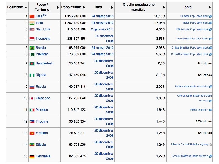Ora osserva la tabella, nella prossima slide, che rappresenta i quindici Paesi più popolati del mondo. B. Poi rispondi alle seguenti domande: Quali sono i primi tre Paesi in classifica? Su questi primi quindici Paesi, quanti sono quelli asiatici? E quelli delle Americhe? E quelli africani? E quelli europei?