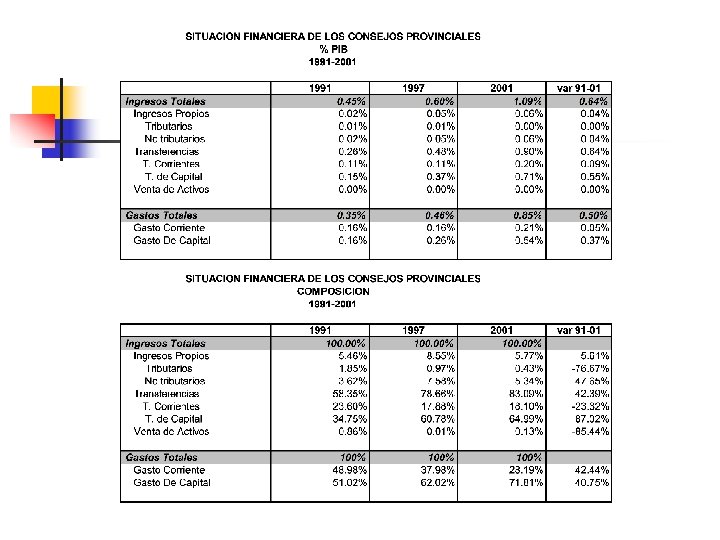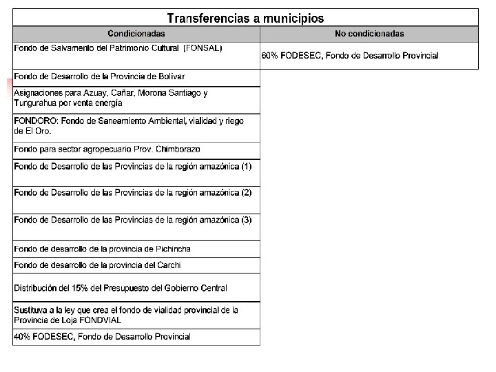 v Ley de distribución del 15% a gobiernos seccionales Fondo de descentralización: Para invertir en proyectos de desarrollo económicos, social y cultural. 50% PNBI prov. / PNBI país 30% Consejos Provinciales 10% superf. prov. / superf. país 40% pobl. prov. / pobl. país 10% en partes iguales 70% Municipios 50% PNBI 50% población 40% pobl. cantón / pobl. país 50% PNBI cantón / PNBI país v. Ingresos propios: imp. Prediales, tasas, contrib. espec. por mejoras. v. Cooperación internacional, créditos (Ley de transparencia, responsabilidad y estabilidad fiscal).