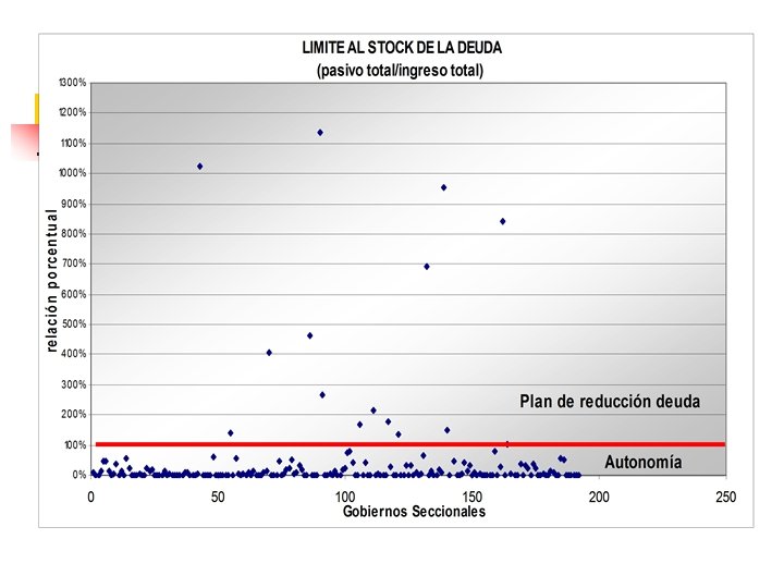 Endeudamiento subnacional La ley de responsabilidad fiscal (reglas macrofiscales): Límite a la deuda pública total: 1. n 40% del PIB (reducción de 16 puntos porcentuales durante 4 años hasta llegar a la meta). Límite de endeudamiento a los gobiernos seccionales: 2. n n Relación porcentual entre pasivos totales y los ingresos totales máximo 100%. El servicio anual de la deuda con respecto a los ingresos totales no podrá ser superior al 40%.