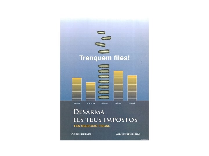 Què és? L'Objecció Fiscal és la disposició a no col·laborar amb l'Estat en les despeses de preparació de les guerres i del manteniment de l'exèrcit. Una forma de desobediència civil activa al moment de fer la declaració de la renda que consisteix tècnicament a desviar una part d'aquest impost a un projecte que es destini a la defensa d'un progrés social solidari; A més hem de tenir en compte que desviar diners de fins militars a fins solidaris és crear autèntica seguretat.