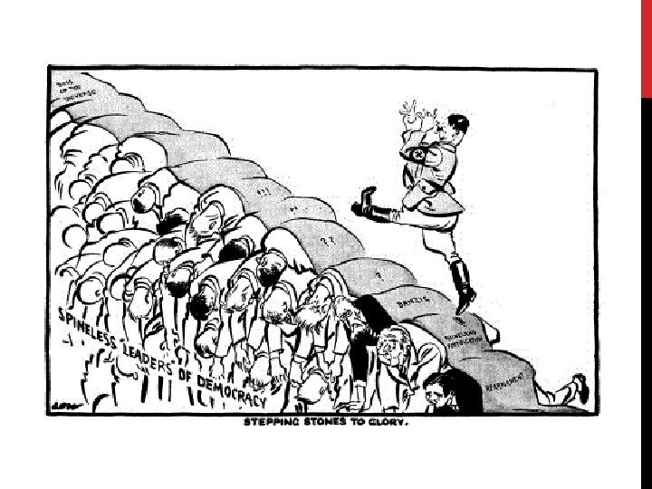 LA TCHÉCOSLOVAQUIE ET LES ACCORDS DE MUNICH, SEPTEMBRE 1938 La Tchécoslovaquie était un autre pays créé par le traité de Versailles Beaucoup d’immigrants dans le territoire de Sudètes (aujourd’hui partie de la République tchèque) venaient d’Allemagne Hitler a proposé de « libérer des Allemandes Sudètes » À une réunion à Munich, les représentants d’Italie, de la France, de la G-B ont rencontré Hitler pour discuter la Tchécoslovaquie (U-S et Tchécoslovaquie n’étaient pas invités) Ils ont décidé qu’Hitler pouvait garder le territoire des Sudètes mais c’était tout!