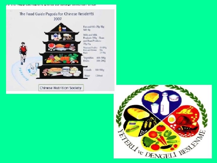 Cina La Pagoda: alla base si trovano i cereali (farine, riso, mais, sorgo ecc…) che rappresentano la fonte principale di energia e di proteine. Nel livello superiore si trovano la frutta e la verdura, mentre al terzo livello troviamo il pesce, la carne e le uova. Anche la Pagoda cinese suggerisce un consumo limitato di carne, preferendo quella bianca e al massimo un uovo al giorno. In cima si trovano il latte e i suoi derivati, i legumi, i condimenti e lo zucchero. Turchia Temel Besin Gruplari: nelle linee guida turche, sono spiegati i contenuti nutritivi di ogni gruppo di alimenti, i vantaggi che il corpo umano trae dalla loro assimilazione e i consigli su come prepararli in modo da esaltare al massimo le potenzialità nutrizionali. Per l’assunzione di proteine si consiglia l’assunzione di carne bianca e pesce, ma anche di legumi che dovrebbero essere consumati insieme ai cereali. I colori della frutta e della verdura indicano la presenza di sostanze nutritive diverse e per questo è meglio consumarne diverse varietà. È consigliabile mangiare la frutta con la buccia e la verdura cruda , poiché le vitamine e i minerali, si condensano negli strati più esterni.