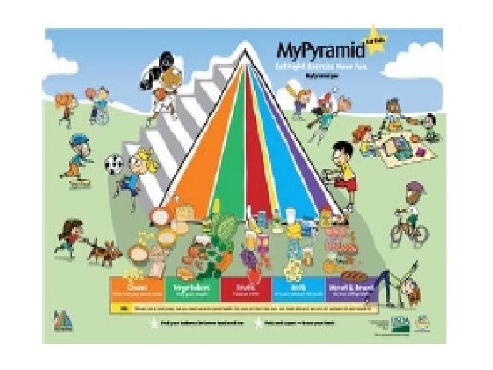 Stati Uniti Choose. My. Plate: sono le linee guida per gli americani dai due anni in su e in condizioni normali di salute. I nutrizionisti americani raccomandano una dieta costituita da frutta, verdura, cereali integrali e prodotti lattiero-caseari magri. In quantità minori vanno consumati carne, pesce, legumi, uova e frutta secca, prestando attenzione ai cibi salati e dolcificati e contenenti grassi saturi, nonché alle bevande dolci. Sono raccomandati un’attività fisica costante e una maggiore attenzione al calcolo del fabbisogno calorico giornaliero. My Pyramid for kids: è la piramide alimentare dei bambini, di età compresa tra i sei e gli undici anni. La piramide è costruita con una grafica colorata che evidenzia le tipologie di cibo che dovrebbero essere consumate ogni giorno.