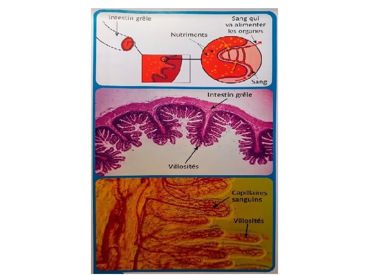 Séance 4: Le rôle de l’intestin grêle dans la digestion Quel est le rôle de l’intestin grêle dans la digestion ? Voir fiche séance 4 Les aliments ont déjà été dégradés grâce aux sucs gastriques présents dans l’estomac. La digestion se poursuit dans l’intestin grêle: la bile, sécrétée par le foie, et le suc pancréatique, sécrété par le pancréas, continuent de dégrader les aliments en petites particules. Ces petites particules, appelées nutriments, sont ensuite absorbées puis envoyées dans le sang grâce aux villosités présentes dans les parois de l’intestin. Les nutriments servent à nourrir le corps et à le faire fonctionner. Tout ce qui n’a pas été absorbé est transporté par le gros intestin et est évacué par l’anus: ce sont les selles. www. ardoise-craie. fr